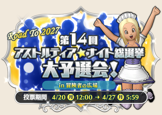 - 04月20日(月)12:00 【広場】第14回アストルティア・ナイト総選挙大予選会!